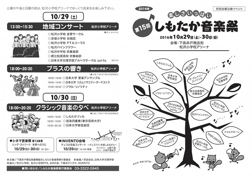 演奏会演奏会詳細 第15回しもたか音楽祭 演奏会 2025.08.17 日時 2016年10月29日(土) 19:40 ~ 20:20 会場 松沢小学校 京王線 下高井戸駅 徒歩2分 東急世田谷線 下高井戸駅 徒歩1分 主催 下高井戸商店街振興組合 曲目 東京オリンピックファンファーレ 今井光也 海の男たちの歌 R.W.スミス 勇気100% 馬飼野康二 バレエ音楽「くるみ割り人形」より P.I.チャイコフスキー 真田丸メインテーマ 服部隆之 伝説のご長寿番組メドレー 小島里美 情熱大陸 葉加瀬太郎 入場料 無料 ← 前の演奏会 2016/05/29 第14回定期演奏会 次の演奏会 → 2016/12/25 Christmas Concert 2016
