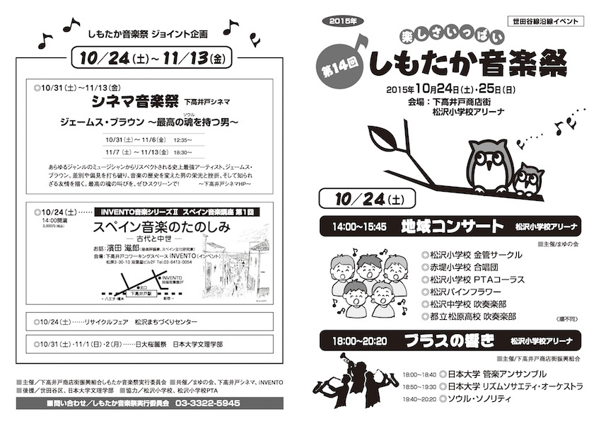 日時2011年10月29日(土) 19:40 ~ 20:20会場松沢小学校京王線 下高井戸駅 徒歩2分東急世田谷線 下高井戸駅 徒歩1分主催下高井戸商店街振興組合曲目ディズニー・ファンティリュージョン 星出尚志嵐メドレー川の流れのように 見岳章G線上のアリア J.S.バッハラッキードラゴン 福島弘和上を向いて歩こう 中村八大入場料無料