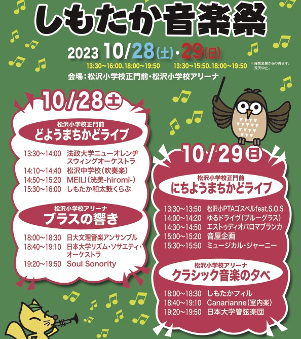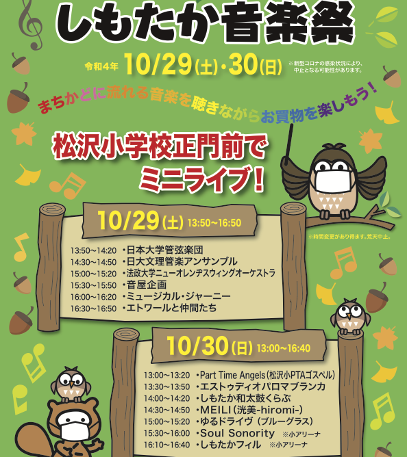 日時2017年10月28日(土) 19:40 ~ 20:20会場松沢小学校京王線 下高井戸駅 徒歩2分東急世田谷線 下高井戸駅 徒歩1分主催下高井戸商店街振興組合曲目アンパンマンマーチ 三木たかしシングシングシング L.プリマオリエント急行 P.スパークパイレーツオブカリビアン K.バデルト少年時代 井上陽水・平井夏美美女と野獣 A.メンケン前前前世 野田洋次郎入場料無料