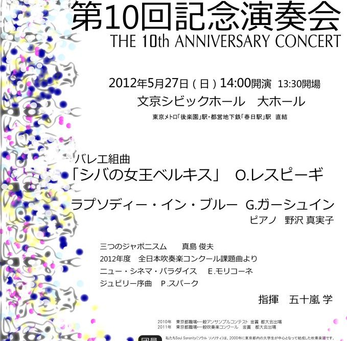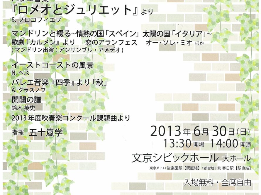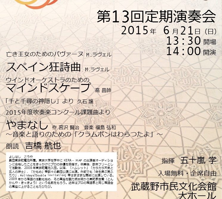 日時2015年6月21日(日) 13:30開場 14:00開演会場武蔵野市民文化会館 大ホールJR三鷹駅北口より徒歩約13分曲目第一部マーチ「プロヴァンスの風」 田坂 直樹マーチ「春の道を歩こう」 佐藤 邦宏「千と千尋の神隠し」より 久石 譲ウインドオーケストラのためのマインドスケープ 高 昌帥第二部「やまなし」~音楽と語りのための「クラムボンはわらつたよ」~ 福島 弘和亡き王女のためのパヴァーヌ M.ラヴェルスペイン狂詩曲 M.ラヴェル入場料無料