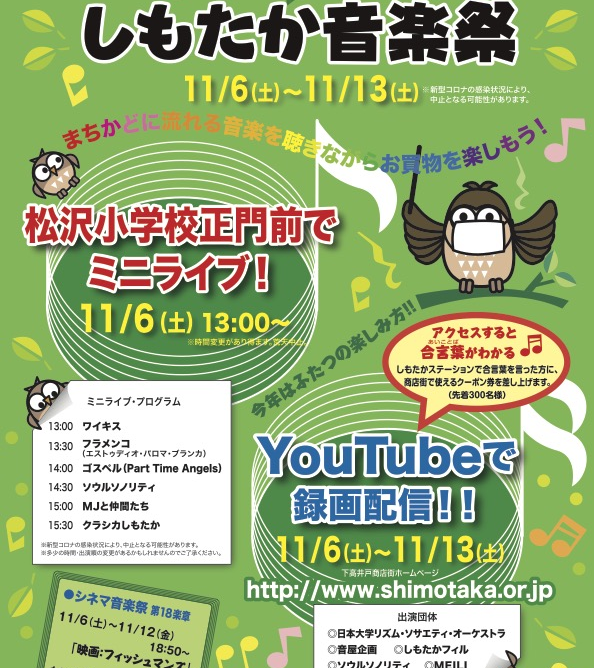 日時2015年10月24日(土) 19:40 ~ 20:20会場松沢小学校京王線 下高井戸駅 徒歩2分東急世田谷線 下高井戸駅 徒歩1分主催下高井戸商店街振興組合曲目スターウォーズ J.ウィリアムズようかい体操第一 菊谷知樹グローバル・ヴァリエーション N.ヘス青春の輝き J.ベティス・A.ハモンドお酒ソング・コレクション~酔奏楽の為の~ 辻峰拓ルパン三世のテーマ 大野雄二入場料無料
